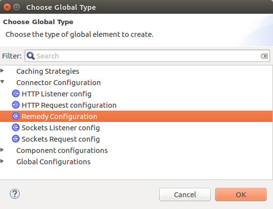 [Choose Global Type (グローバル種別の選択)] ウィザードで、[Connector Configuration (コネクタ設定)] を展開し、[Remedy Configuration (Remedy 設定)] を選択し、[OK] をクリックします。