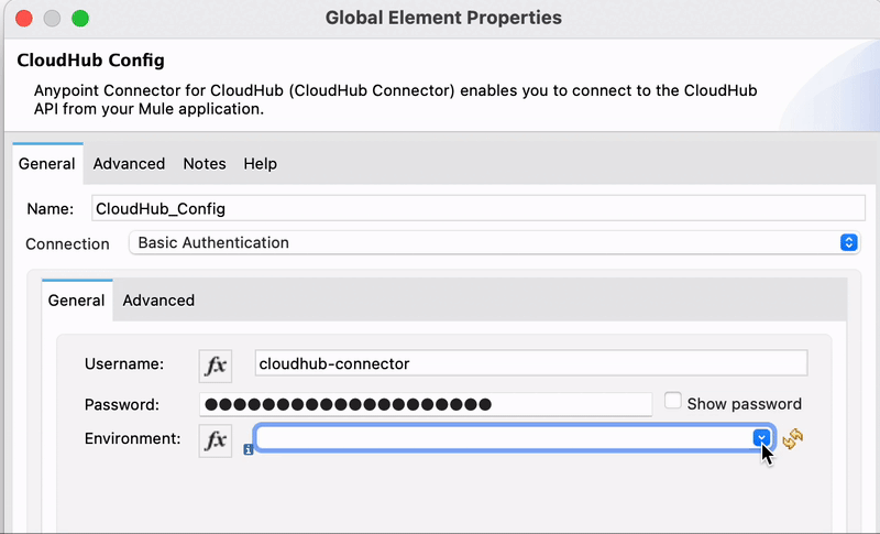 CloudHub Connector は、/account API エンドポイントから使用可能な環境を取得できず、空のドロップダウンリストが表示されることがあります。[OAuth Client Credentials (OAuth クライアントログイン情報)] 接続種別を使用している場合、[Environment (環境)] 項目は省略可能であるため、ドロップダウンリストが空でも問題は発生しません。